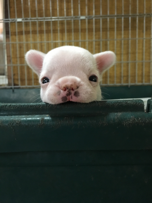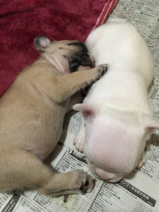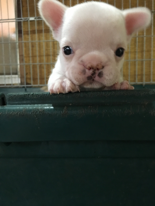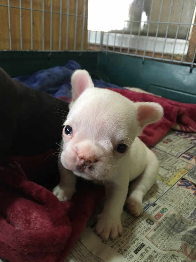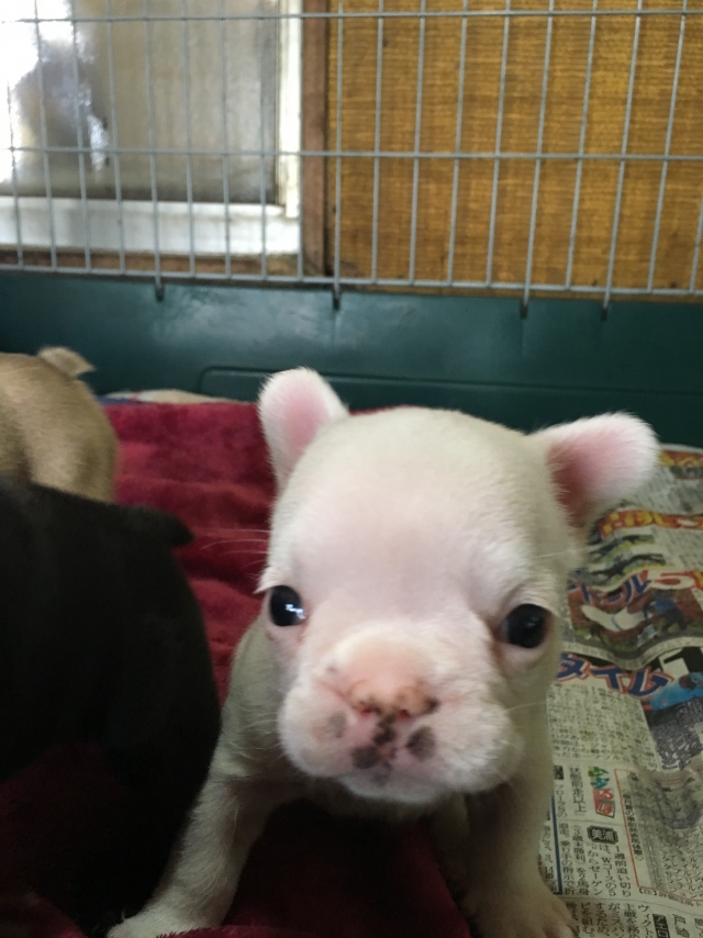 コメント | 父犬ブリンドル、母犬パイドから産まれた3人兄妹のホワイトの男の子です。 現在は昼間は兄妹たちとご飯をたくさん食べ、よく遊び、よく寝て 夜はお母さんのお乳を飲み、順調に成長しています。 見学はいつでもできますのでお気軽にお問い合わせください。 見学時間は午後1時~午後5時ごろまでです。 午前中の見学をご希望の方はお問い合わせ時にお伝えください。 |