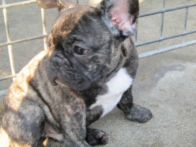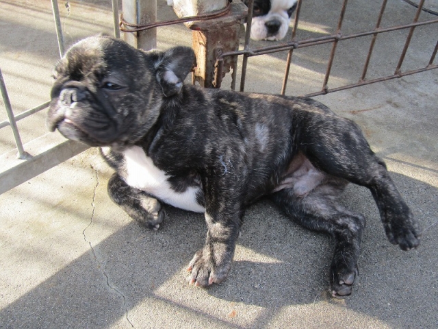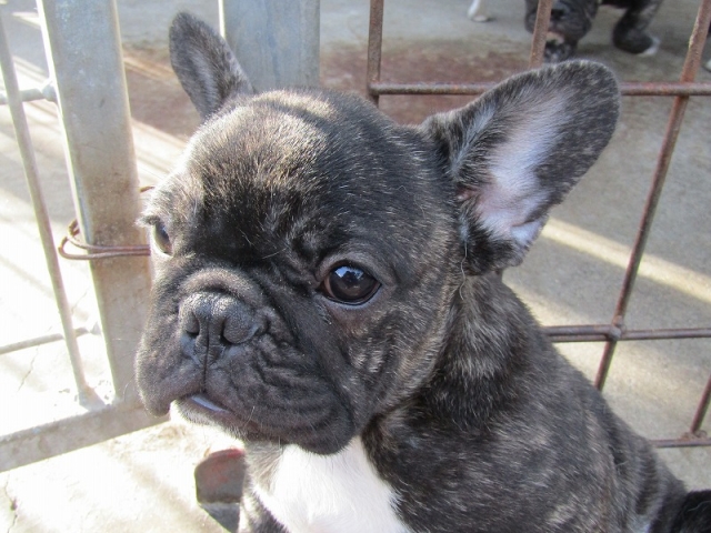 | コメント | 父犬フォーン、母犬ブリンドルから生まれたブリンドルの男の子です。 現在の体重は4.5キロ前後で大きくなりましたが、やはり目がクリクリのかわいい男の子です。 性格は結構ヤンチャさんでしたが、最近は少し落ち着きとてもおとなしい子です。 ワンちゃんたちとも仲良く遊んでいます。 小ぶりな男の子ですが、食欲もありとても元気な男の子になりました。 1回目と2回目のワクチン接種と健康診断が済んでいます。 見学はいつでもできますのでお気軽にお問い合わせください。 見学時間帯は午後1時から午後5時ごろまでです。 午前中ご希望の方はお問い合わせ時にお伝えください。 |